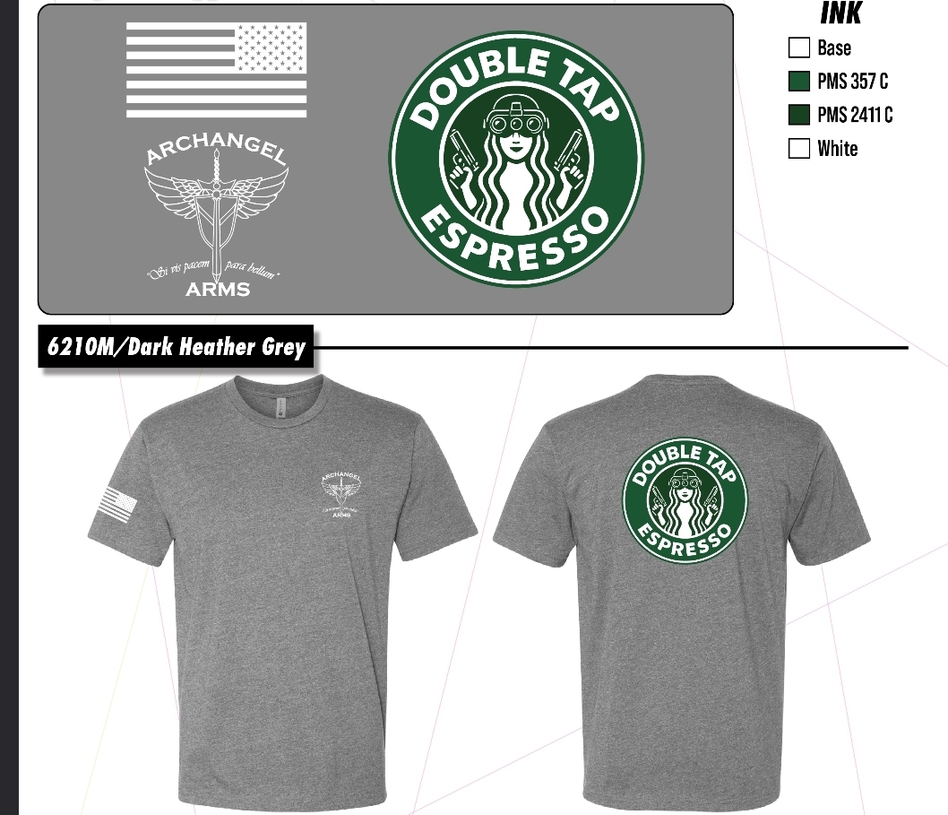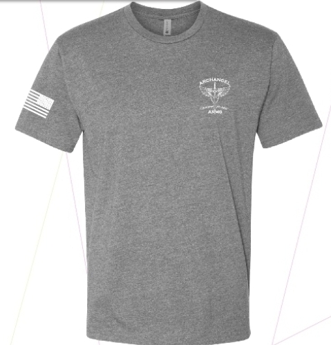 Archangel Arms name and logo on left chest, with the USA flag on the right sleeve, double tap tastefully centered on back.